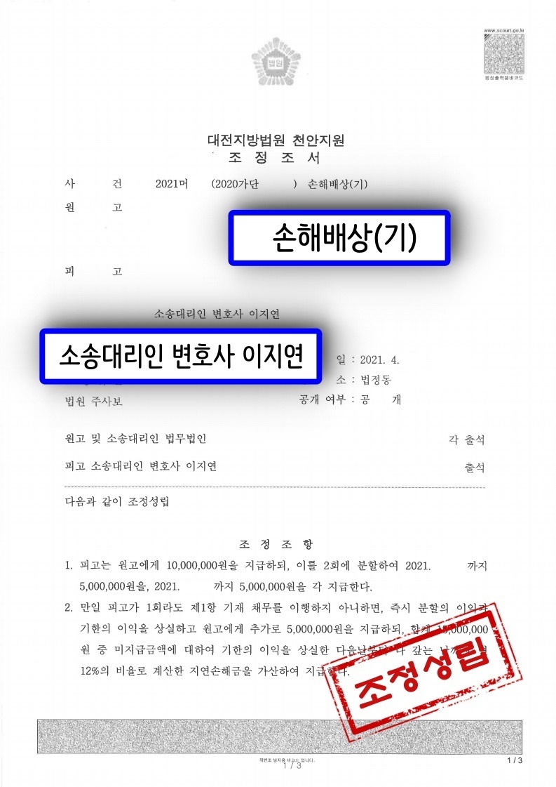 Çǰí´Â ¿ø°í¿¡°Ô 1,000¸¸¿øÀ» Áö±ÞÇÏ´Â °ÍÀ¸·Î Á¶Á¤ÀÌ ÀÌ·ç¾îÁ³½À´Ï´Ù.