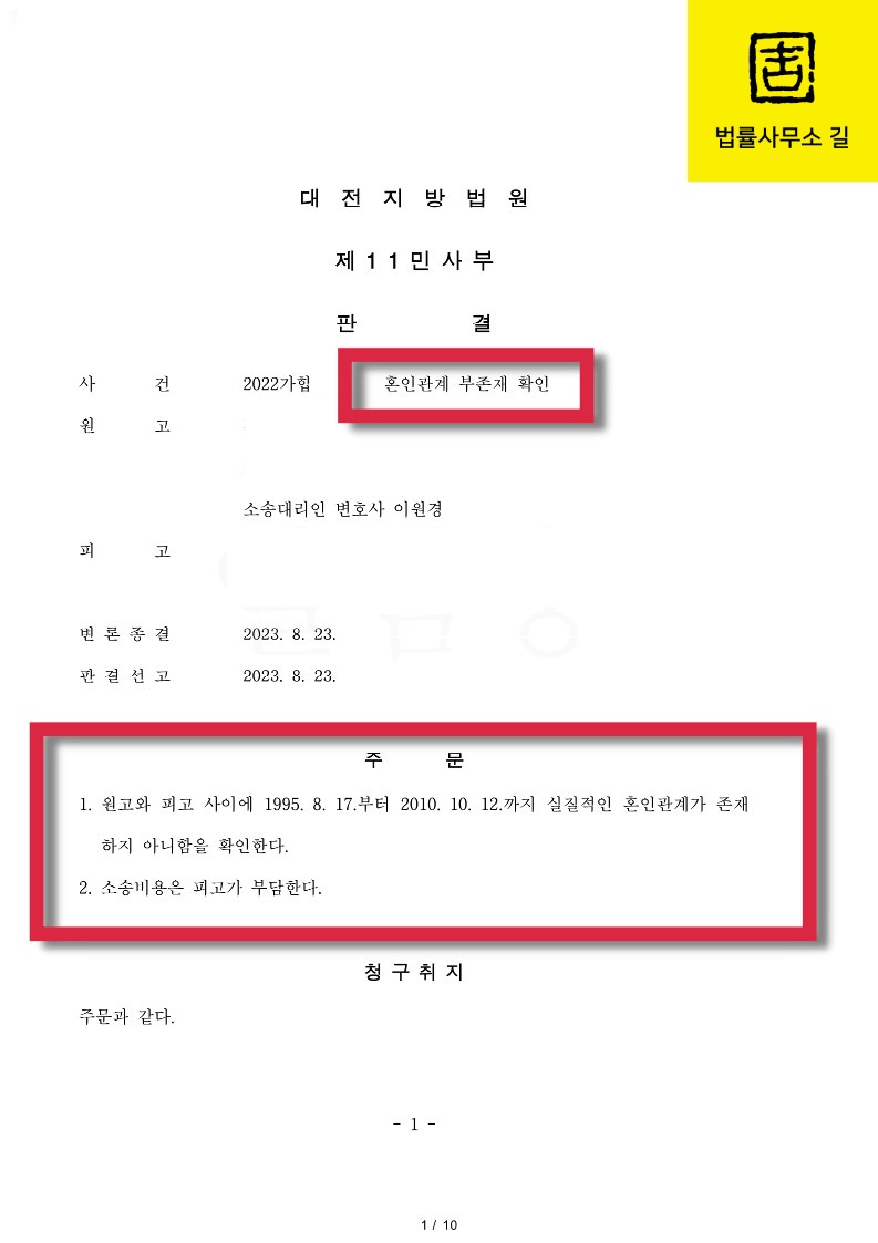 ¿ø°íÀÇ ÀüºÎ ½Â¼Ò·Î ¿ø°í´Â ºÐÇÒ¿¬±Ý´ë»ó±â°£ÀÌ µÇ´Â È¥ÀαⰣ µ¿¾È ½ÇÁúÀûÀΠȥÀΰü°è°¡ Á¸ÀçÇÏÁö ¾Æ´ÏÇÑ´Ù´Â È®ÀÎ ÆÇ°áÀ» ¼±°í ¹Þ°Ô µÇ¾ú½À´Ï´Ù.